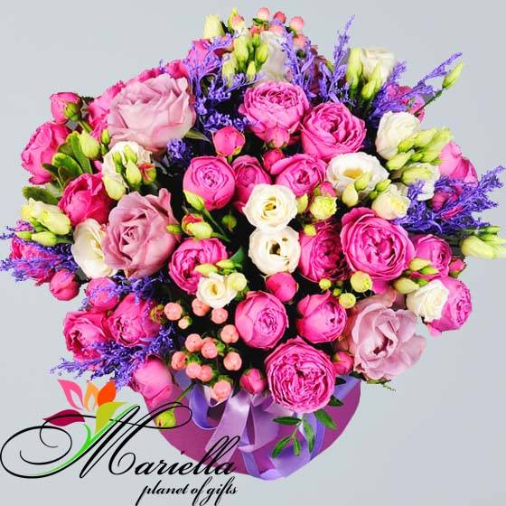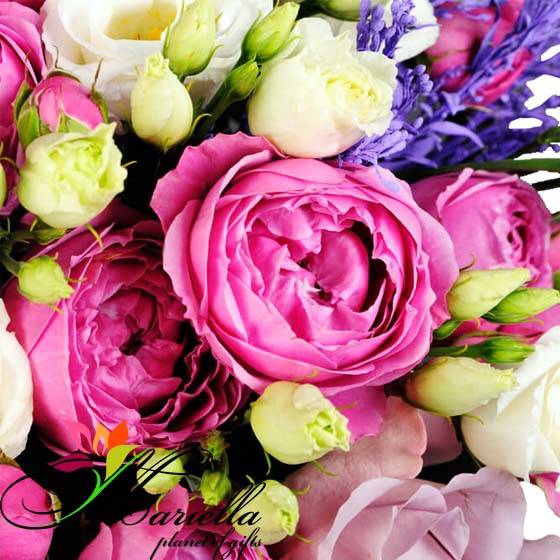 Beautiful pink peony-like bouquets of roses, beautiful white lisianthus and the freshest flowers (decor) in a wonderful composition.