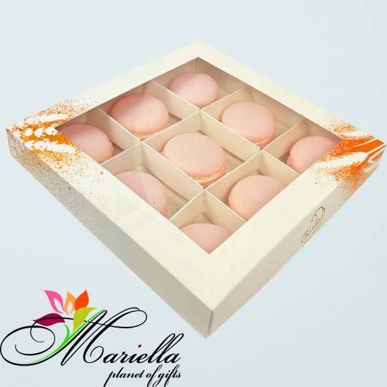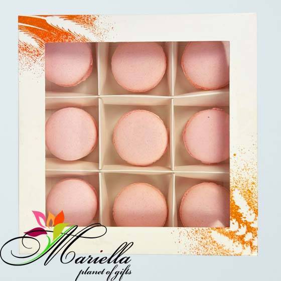 Box of 9 pink macarons.