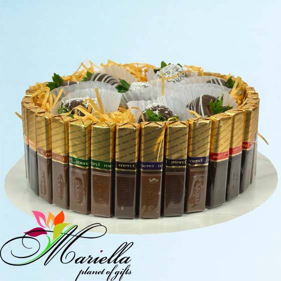 Քաղցր կոմպոզիցիա “Merci” կոնֆետներով և շոկոլադապատ ելակներով՝ անկրկնելի ձևավորմամբ ու դեկորով: Շտապե´ք նվիրել այս գեղեցիկ, քաղցր կոմպոզիցիան ձեր սիրելիին, դարձնելով իր օրը լի` սիրով, նրբությամբ և ուշադրությամբ։
