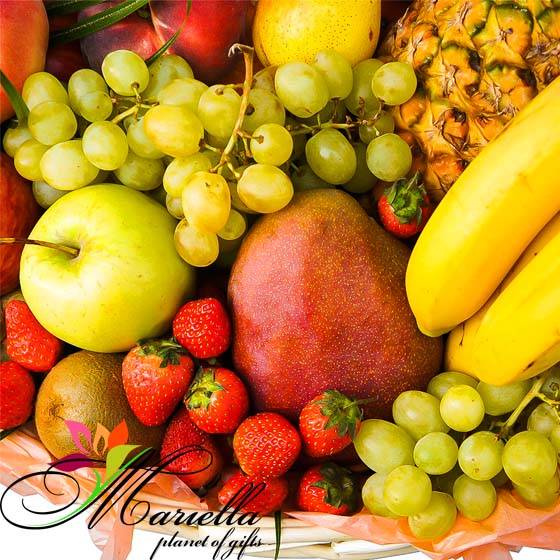 Эта эффектная фруктовая корзина наполнена свежими сезонными фруктами — бананами, ананасом, виноградом, яблоками, грушами и клубникой. Она красиво оформлена в плетёной корзине и станет идеальным подарком для дня рождения, юбилея, делового партнёра или близкого человека. Натуральная свежесть и витамины в каждом кусочке — символ заботы и внимания.